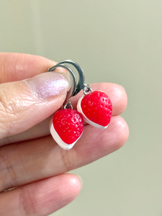 Strawberries and cream gummy candy earrings (mini huggies) - Handmade from polymer clay