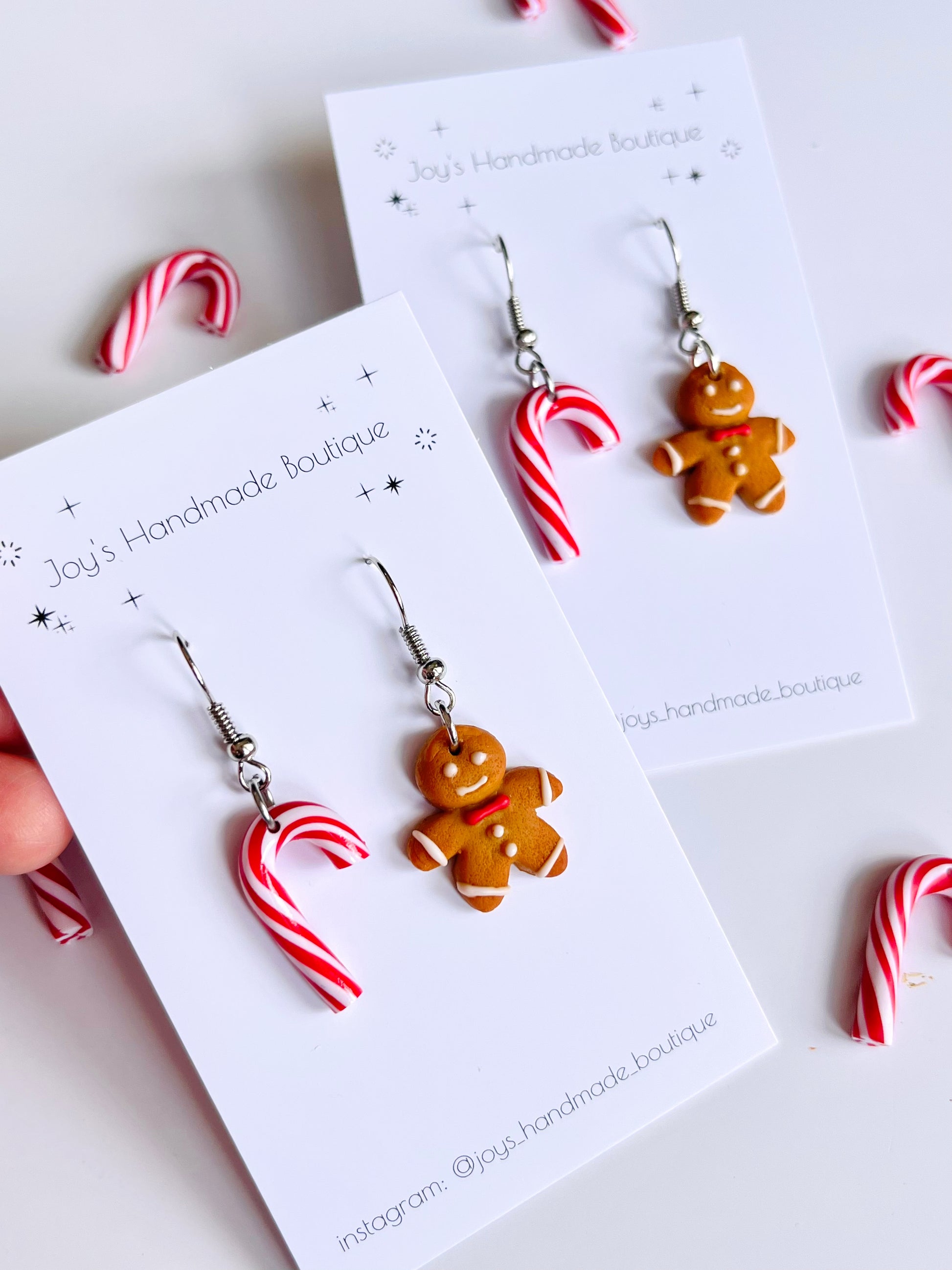 Gingerbread Man and Candy Cane Earrings | Handmade from polymer clay